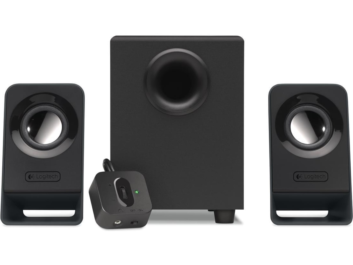 Du trenger ikke å kaste bort verdifull skrivebordsplass for å få god lyd. Den skråstilte utformingen av Z213 fører lyden rett til ørene. - Praktisk kontrollenhet
