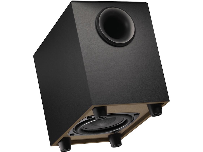 Følbar fyldig bass. En nedovervendt basshøyttaler med 4-tommers element sikrer en rik bassopplevelse med disse 2.1-høyttalerene. - Kompakt, effektiv utforming