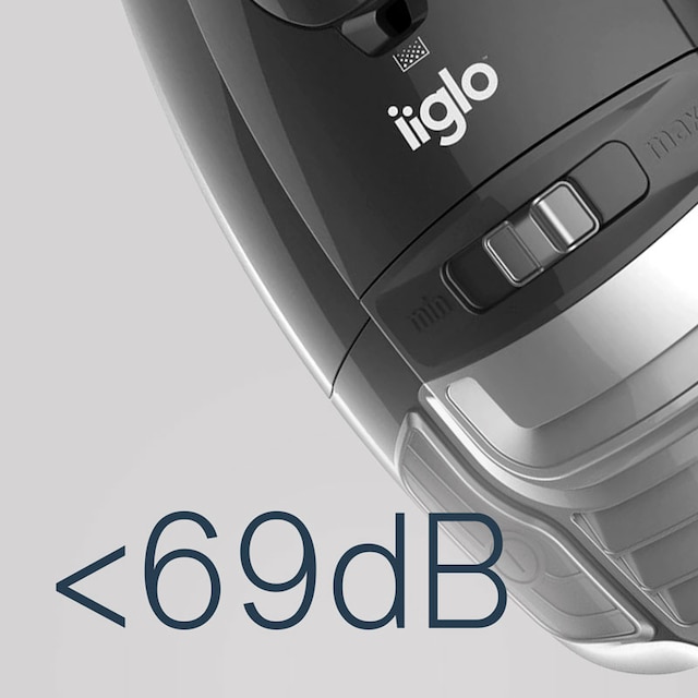 iiglo-støvsugeren er kraftig, men behagelig stille, med et støynivå på bare 69 dbA. Med et slikt støynivå er det mulig å føre en vanlig samtale.