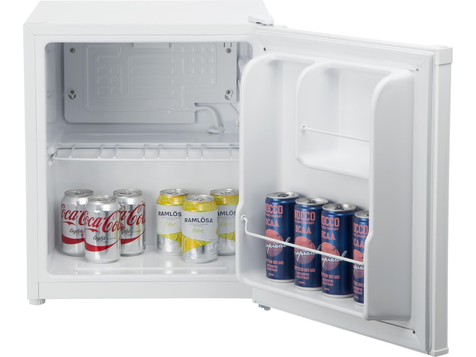 Kjøleskapet rommer 46 liter og en flyttbar trådhylle samt to justerbare dørhyller med plass til flasker gir deg mulighet til å tilpasse kjøleskapet etter dine behov. Døren kan hengsles om og føttene justeres ved behov. Alle hyller i skap og dør kan enkelt tas ut og vaskes. Med en 7-trinns styringsknapp kan du enkelt justere temperaturen i kjøleskapet.