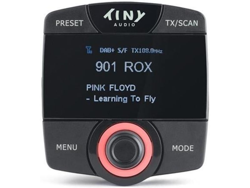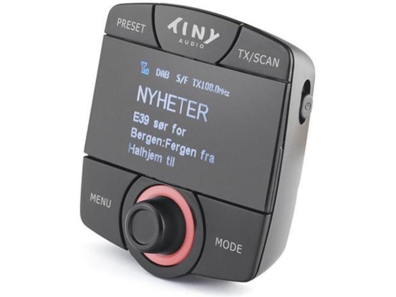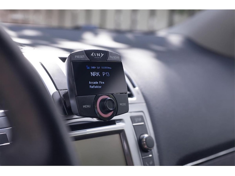 Tiny Audio C6 henter strøm fra 12V-uttaket i bilen, og sender DAB-lyden videre som radiobølger over FM.