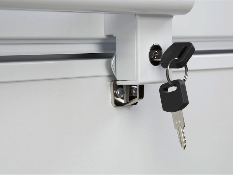 Lokket har stort og solid håndtak og holdes på plass av seg selv når det er åpnet. Håndtaket er satt sammen av to deler som enkelt monteres på lokket av fryseren med fire vedlagte skruer. Dette håndtaket har også en låsmekanisme og fryseren leveres med to nøkler. Dermed kan du låse fryseboksen dersom du har den stående i en utebod eller lignende