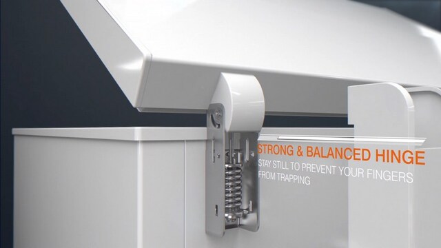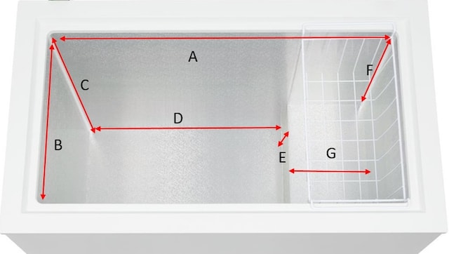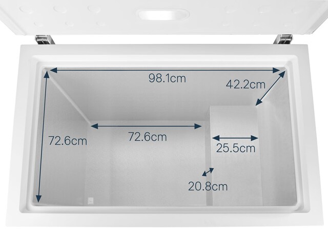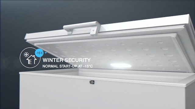Fryserlokket er utstyrt med to solide og balanserte hengsler. Disse holder toppen på plass når den åpnes, og forhindrer skader som fastklemte fingre.