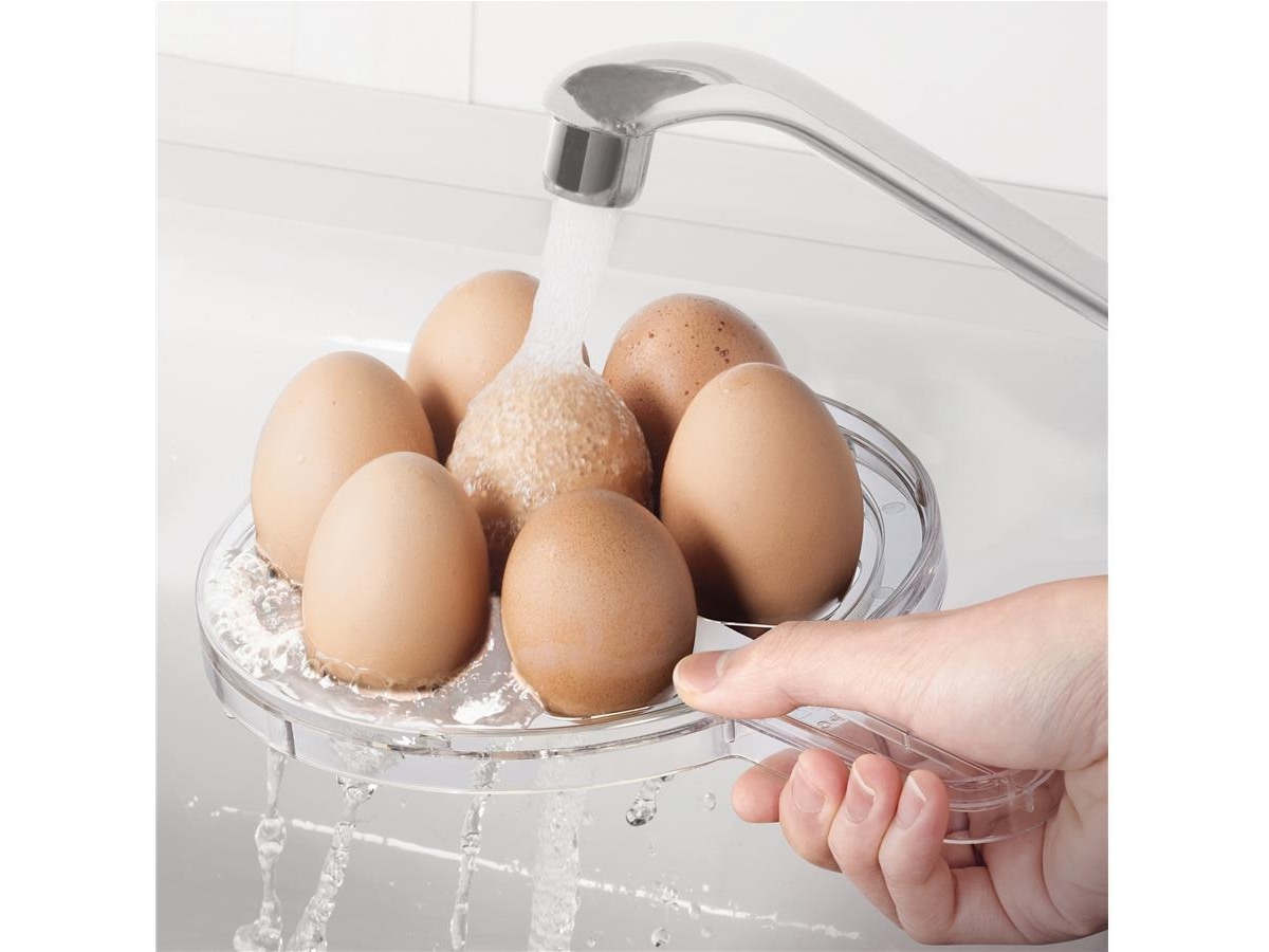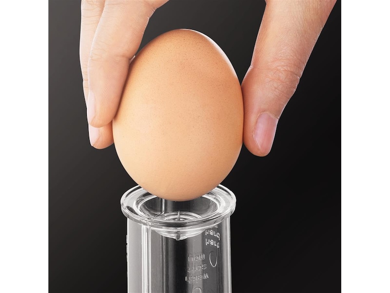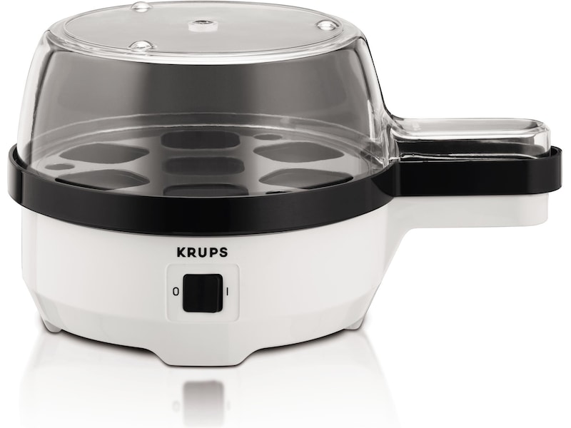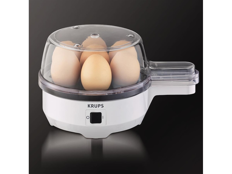KRUPS eggekoker koker fra 1 til 7 egg om gangen. Prikk eggene, sett de i kokeren og hell på vann. Vannmengden er avgjørende for om du ønsker egget bløtkokt eller hardkokt. Slå på bryteren og vent på lydsignalet som indikerer at eggene er ferdigkokte. Målebeger med integrert hullstikker følger med.