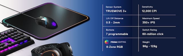 Egenskaper ARM 32-bitsprosessor, SteelSeries TrueMove3+ Dual Sensor, 0,5 mm - 2 mm lettingsavstand, Silikongrep, Zero Hardware Acceleration, TrueMove 3 Optical Gaming Sensor, Bløt berøringsoverflate, 8 RGB-soner, Depth Sensing Linear Optical Detection