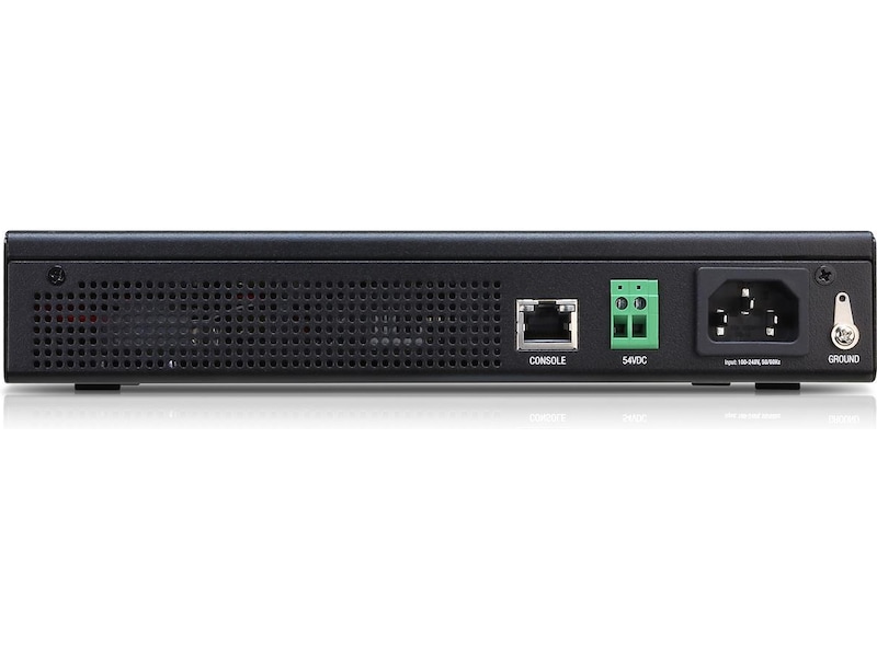 Gigabit-svitsj med (8) RJ45-porter, (2) SFP-porter og en 150 W strømforsyning.